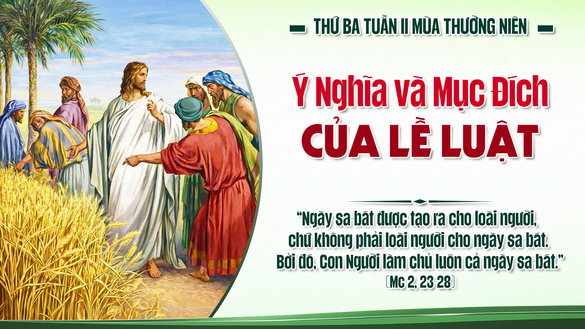 Suy niệm: Vào ngày sa-bát, các môn đệ Chúa Giê-su đi ngang qua cánh đồng, bứt vài bông lúa nhấm nháp cho quên đói, thế mà bị những người Pha-ri-sêu quy kết là vi phạm luật giữ ngày sa-bát. Chúa Giê-su lên án kiểu giữ luật đó, vì nó biến con người thành nô lệ của lề luật thay vì giúp con người thăng tiến.