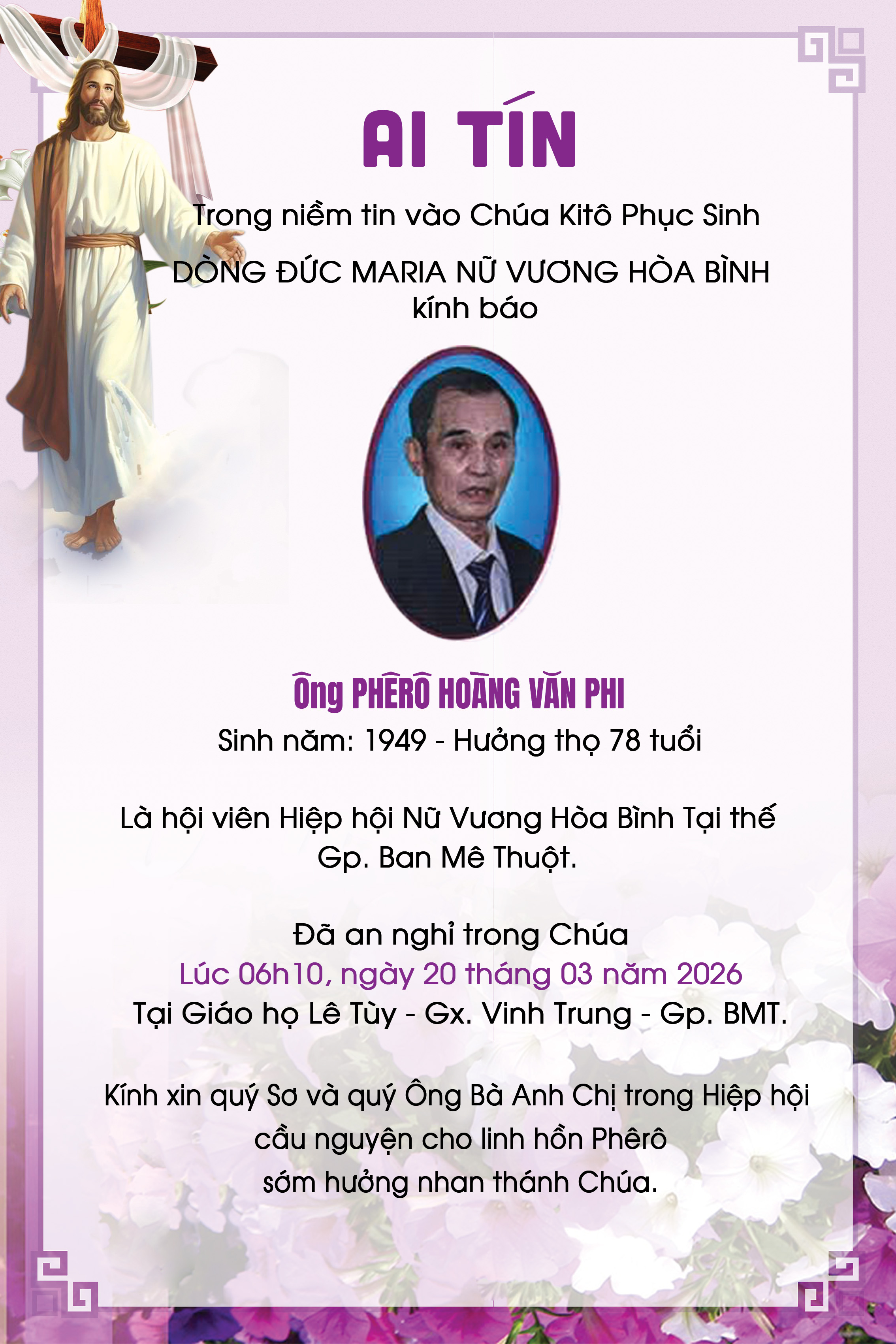 Ai tín: Ông Phêrô Hoàng Văn Phi - Hội viên Hiệp Hội Nữ Vương Hòa Bình Tại Thế