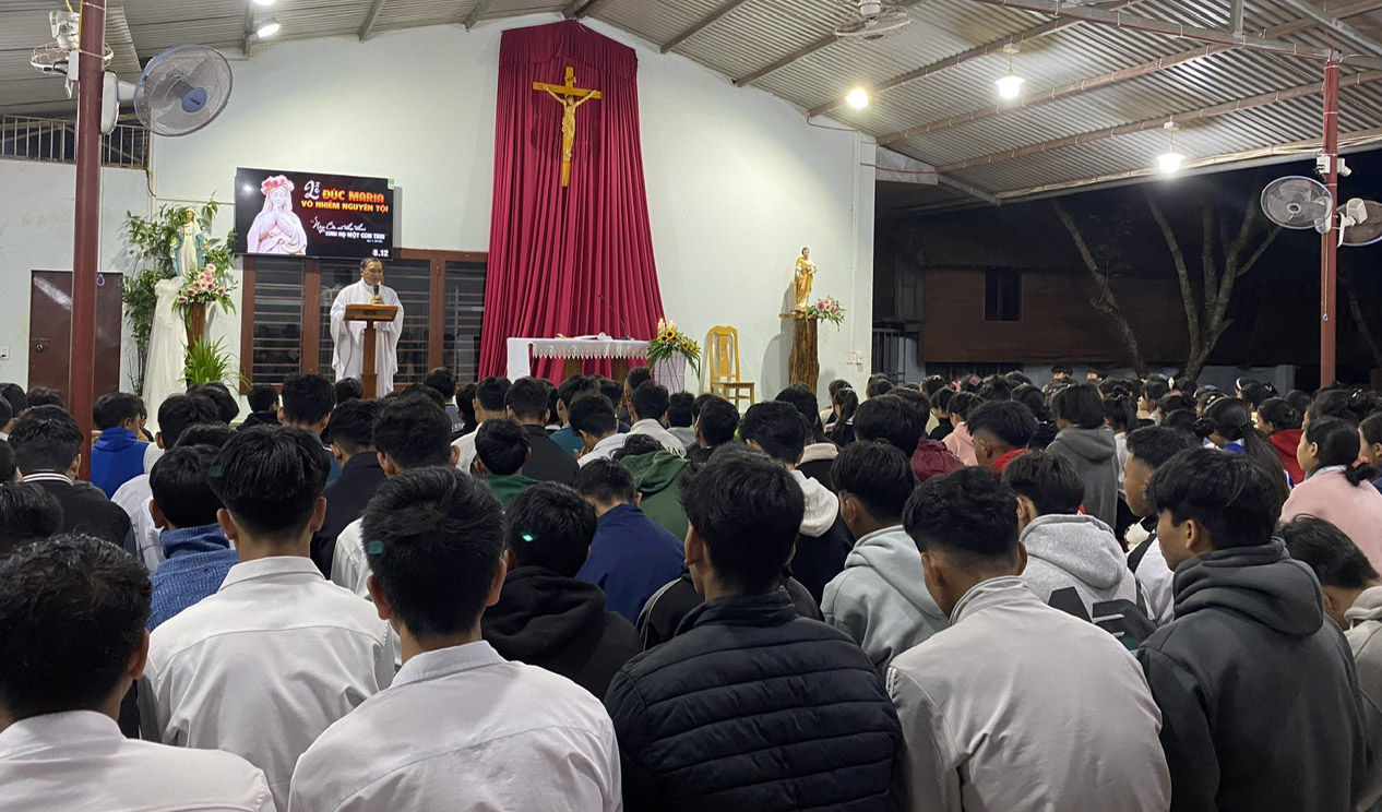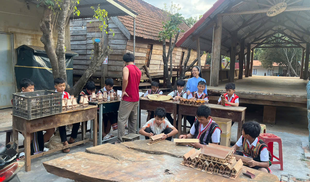 Nếu đến đây vào giờ Thánh lễ ta sẽ thấy nhưng chàng trai cô gái gương mặt tươi tắn, đơn sơ hồn nhiên với những bộ đồ truyền thống sặc sỡ của sắc tộc mình, ta như bị lạc giữa một rừng hoa với đủ loài hoa thật đẹp. Thánh lễ nghiêm trang sốt sắng với những lời ca tiếng hát trầm bổng, thánh thiêng… do các em tự tập hát, đánh đàn, làm ca trưởng…đọc sách, dọn lễ, tất cả các em đều được tập tành để sau này có thể về giúp lại buôn làng của mình. Tôi tình cờ gặp Krony, một chàng trai người Xê Đăng, đang làm việc tại đây. Tôi biết Krony ở đây khi Krony học lớp 10, giờ đây Krony đã là một chàng trai khôi ngô tuấn tú, là người anh Cả nơi đây, Krony và A Tùng cũng là người đồng bào Xê Đăng, các em hành nghề trong xưởng mộc, làm những mặt hàng mỹ nghệ. Krony dẫn tôi đi xem các mặt hàng thật tinh xảo và điêu luyện do tay em làm những mái nhà sàn, quả bầu hồ lô hay những chiếc thuyền mộc được em khắc thật tinh xảo và đẹp mắt…. Các sơ đầu tư đủ các loại máy móc cho công việc trong xưởng mộc được thuận lợi. Tôi hỏi điều gì làm Krony ở lại đây cho đến bây giờ?“Vì con biết các sơ thương con, ở đây con có thể phát huy những tiềm năng của mình…” Nhìn vào khuôn mặt rạng ngời của Krony, tôi thấy ấm lòng.