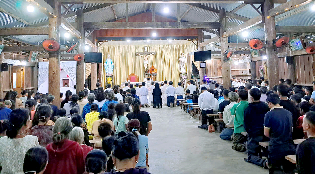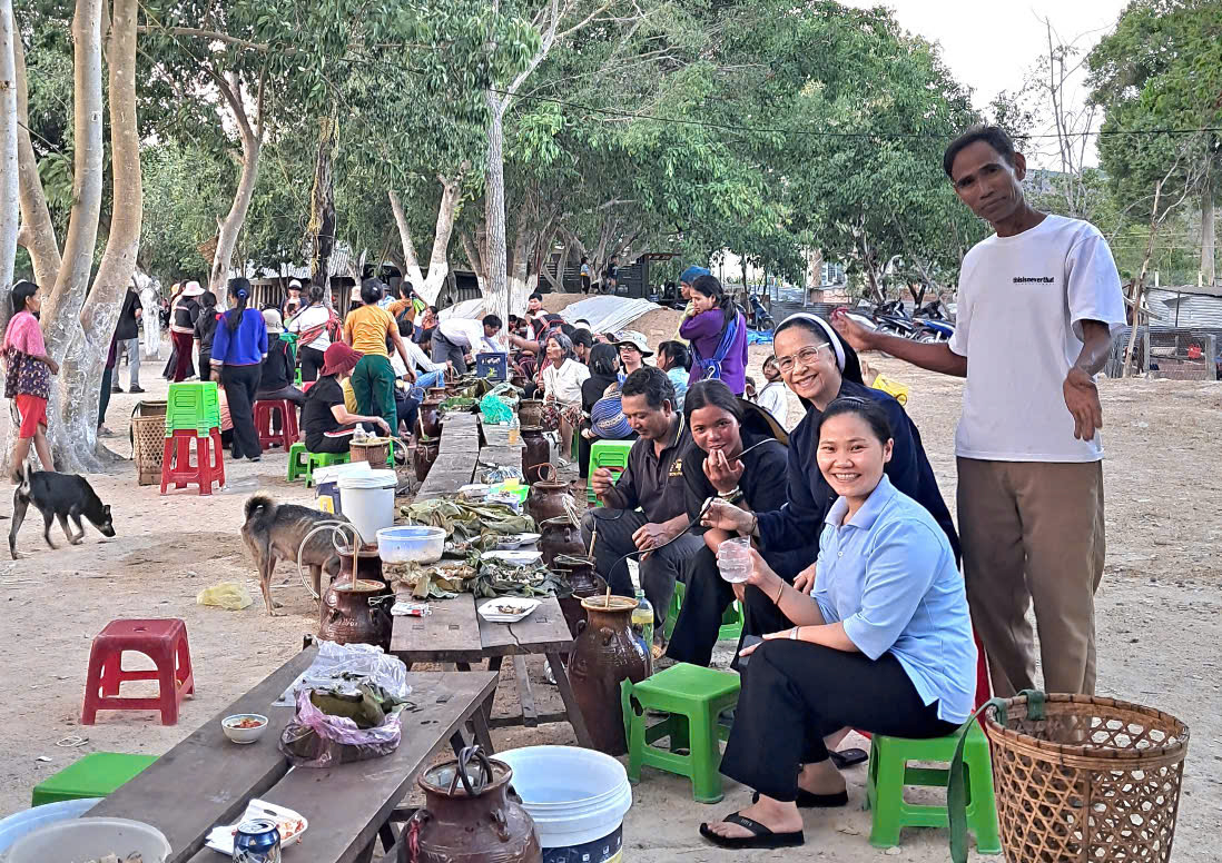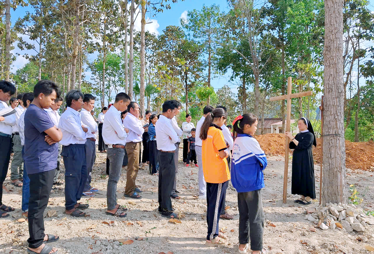 Tuần Thánh 2025, theo lời mời của cha xứ, giáo xứ DE SƠMEY, một giáo xứ cách cộng đoàn Kroong hơn 50 km, về hướng Gia Lai, có hai chị đến đồng hành và hỗ trợ các chú Giáo phu. Theo truyền thống, từ thứ tư đến thứ bảy Tuần Thánh các chú Giáo phu đến phục vụ tại nhà xứ trọn ngày, để giúp cha chuẩn bị các nghi thức Tam Nhật Thánh và Đại lễ Phục Sinh. Năm nay cha giao công việc này cho hai chị em, hướng dẫn khoảng 15 chú từ việc dọn vệ sinh, sắp xếp phòng thánh, chuẩn bị vật dụng, làm nhà Tạm phụ, vệ sinh trong ngoài, đến ẩm thực…