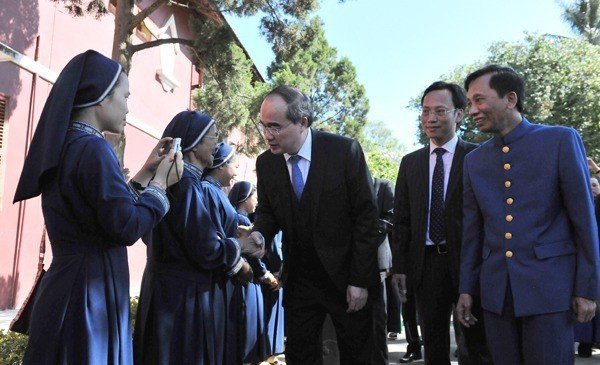 Các nữ tu dòng Ảnh Phép Lạ đón tiếp Ủy viên Bộ Chính trị - Chủ tịch Ủy ban Trung ương Mặt trận Tổ quốc Việt Nam Nguyễn Thiện Nhân về thăm hội dòng năm 2015