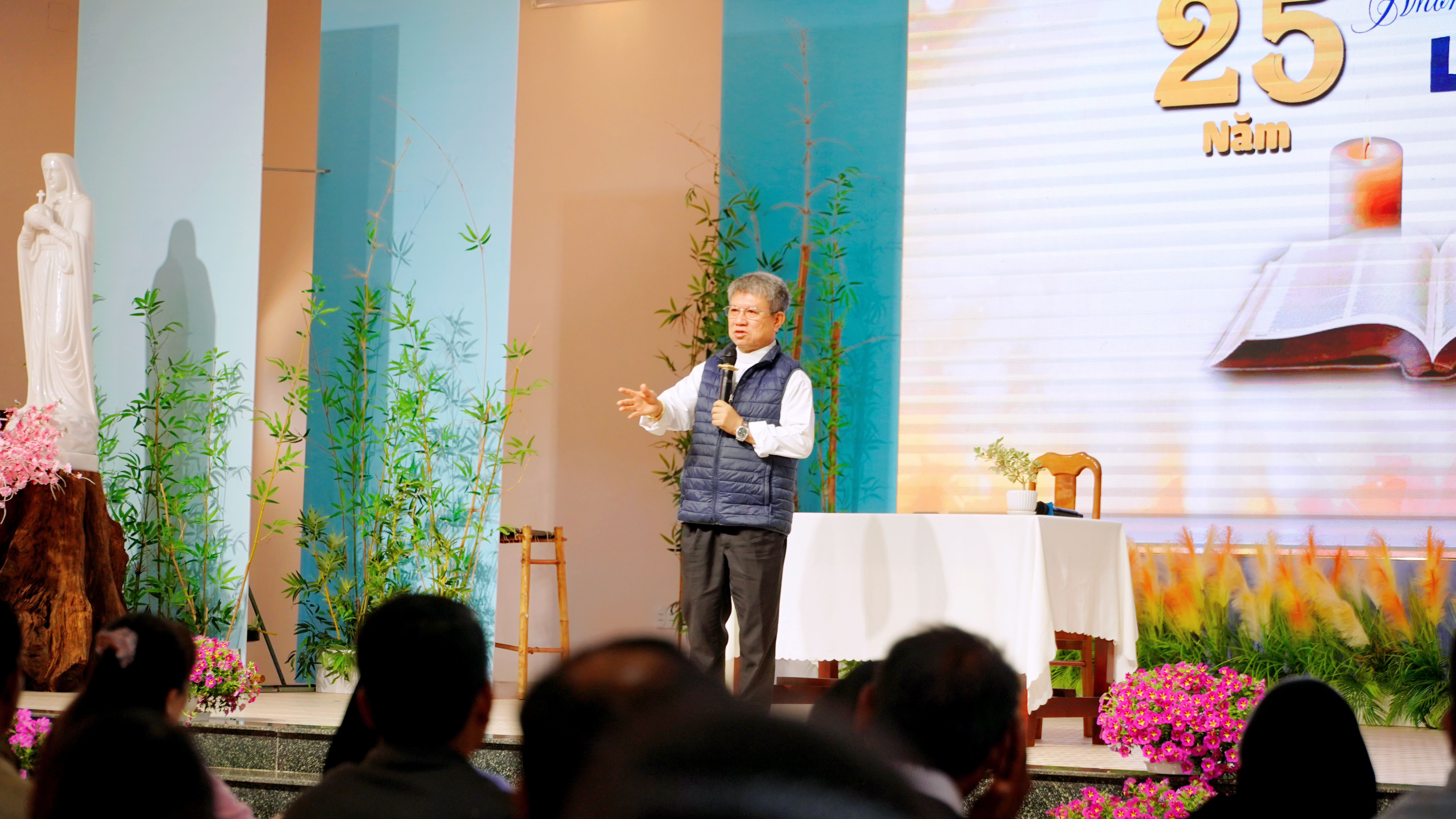 Trong phần chia sẻ, cha Phanxicô Xaviê Trương Hồng Chương mời gọi cộng đoàn ý thức hơn về những thay đổi của bối cảnh xã hội và mục vụ hôm nay, đồng thời khích lệ mỗi người trung thành với việc đọc và sống Lời Chúa mỗi ngày, để trở nên muối men và chứng tá giữa môi trường sống của mình.