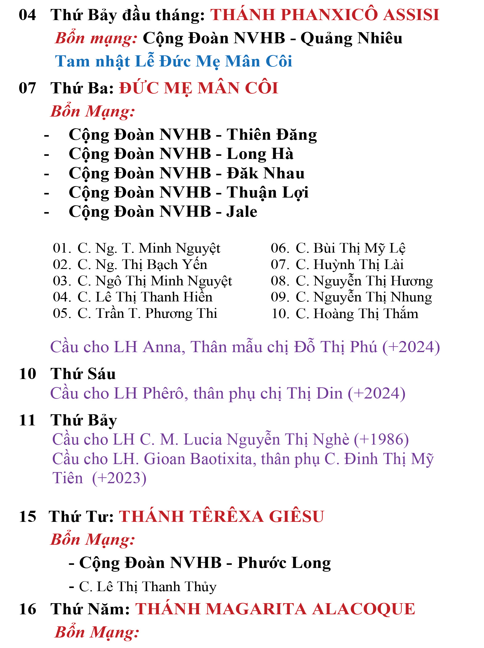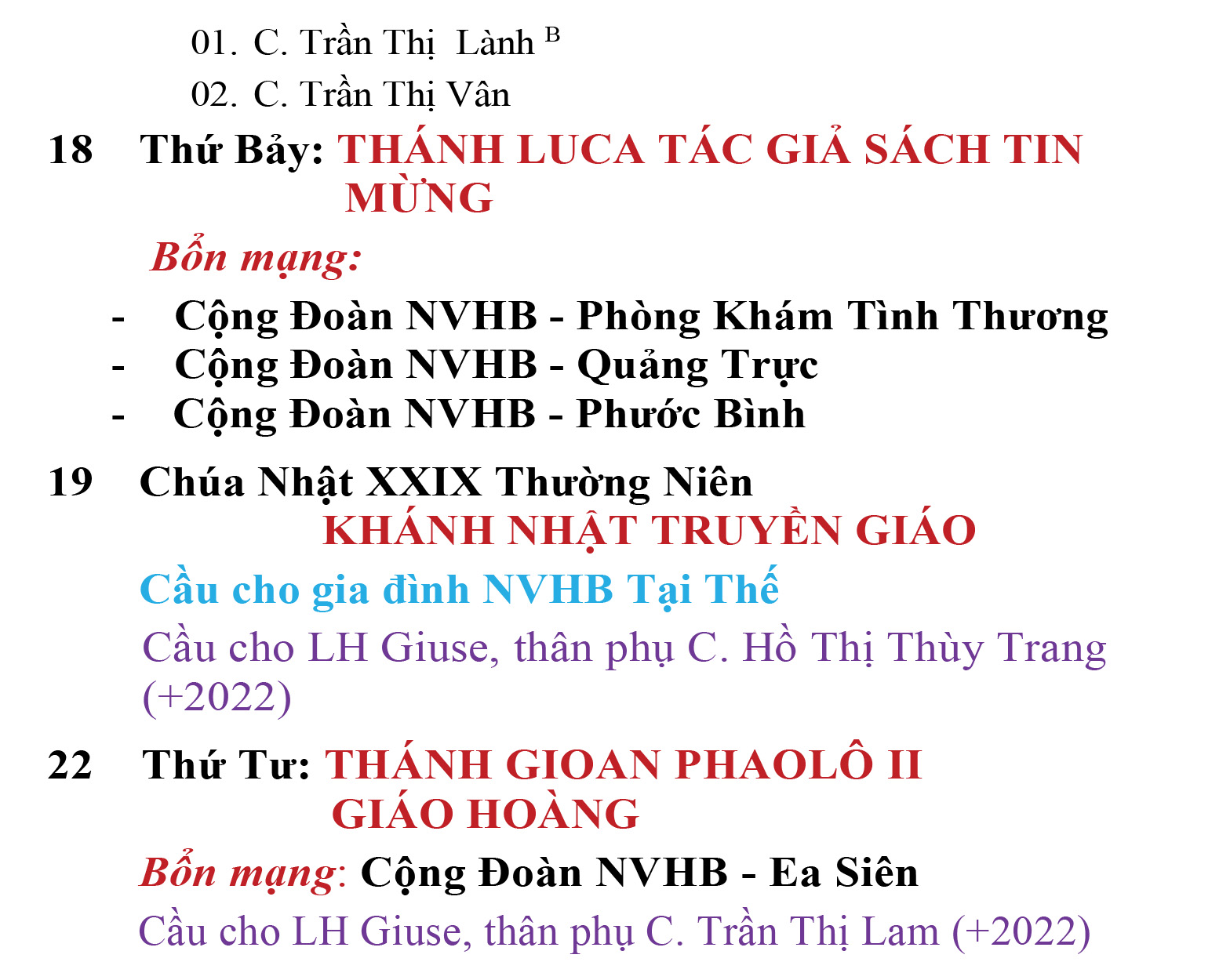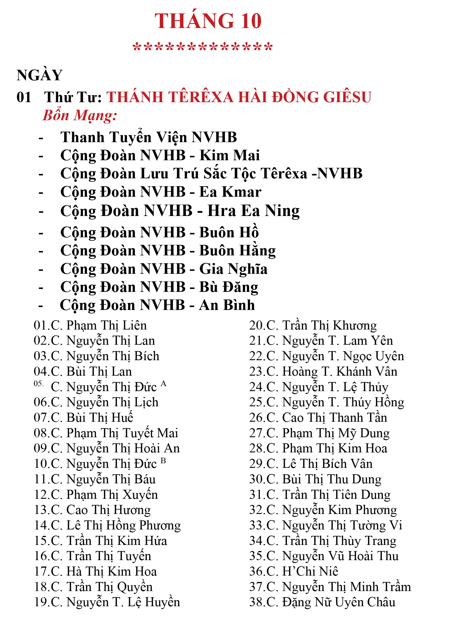 Lịch Phụng Vụ Hội Dòng Tháng 10